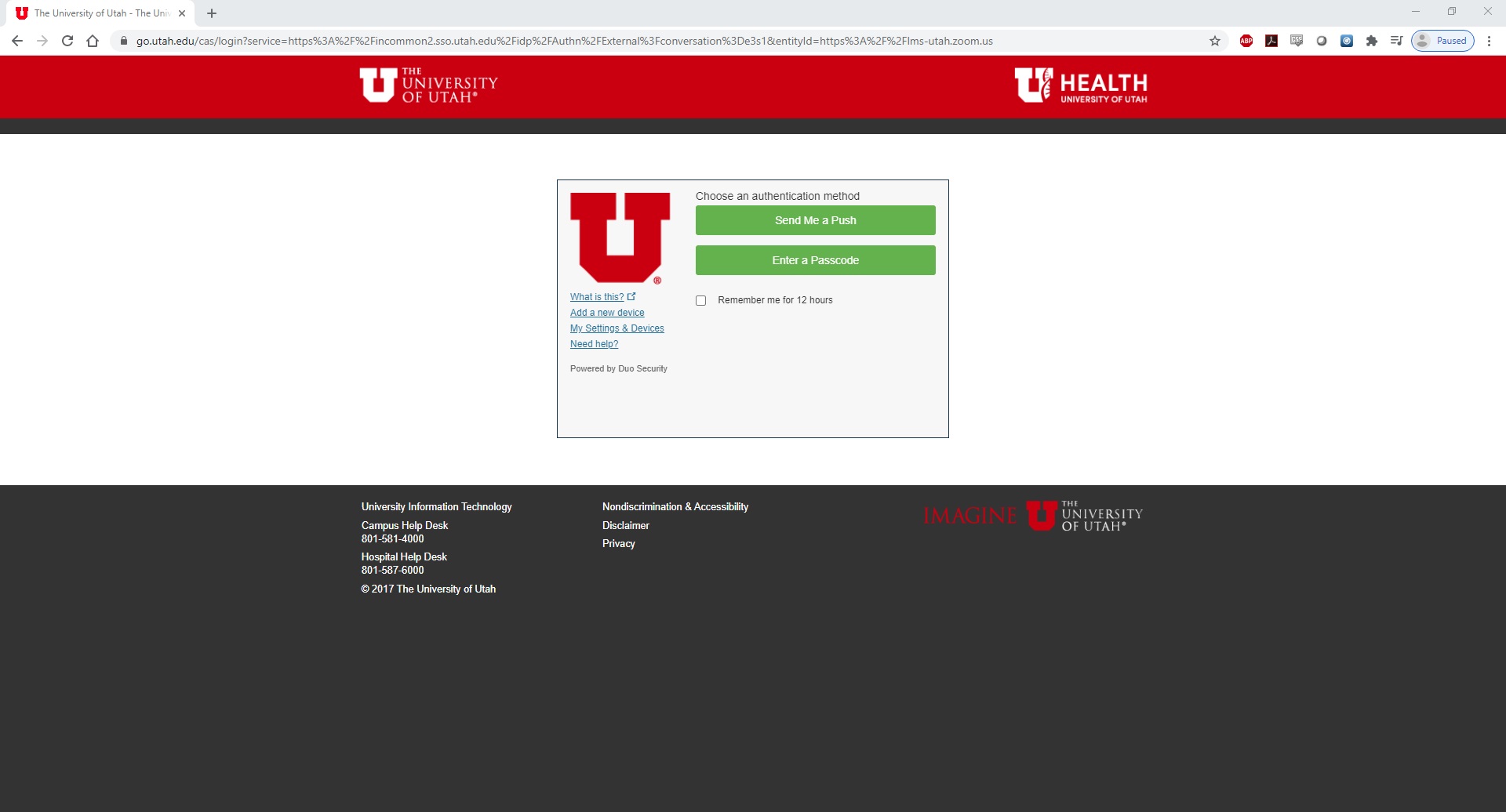 - Log In using your uID and Password as usual, followed by your Duo Sign In Option