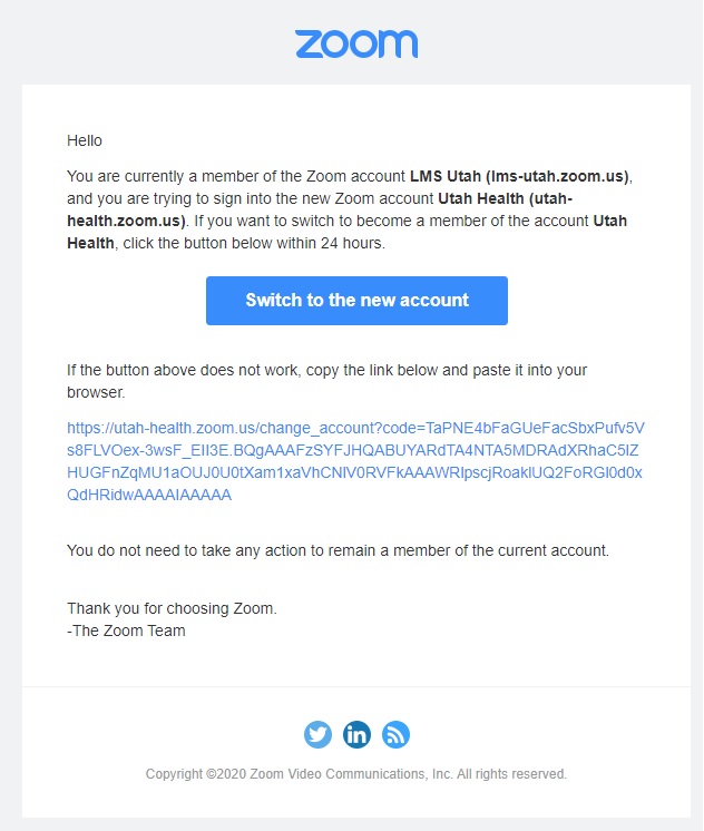 - If you do not see utah-health in the URL, check your [email protected] email, you should have gotten an email to convert your Zoom Account or LMS Zoom Account into an Utah Health account, if you did, approve the change. After that, refresh the Profile page and check. You should now have an Utah Health Zoom Account. Below is a picture is an example of the kind of email you will receive to convert your account. This picture shows converting an LMS Zoom Account to an Utah Health Zoom Account but you can easily convert from one kind of Zoom Account to the other but BE AWARE that LMS accounts are NOT HIPAA compliant, as normal Zoom accounts do not have all the features you will on the U of U campus.