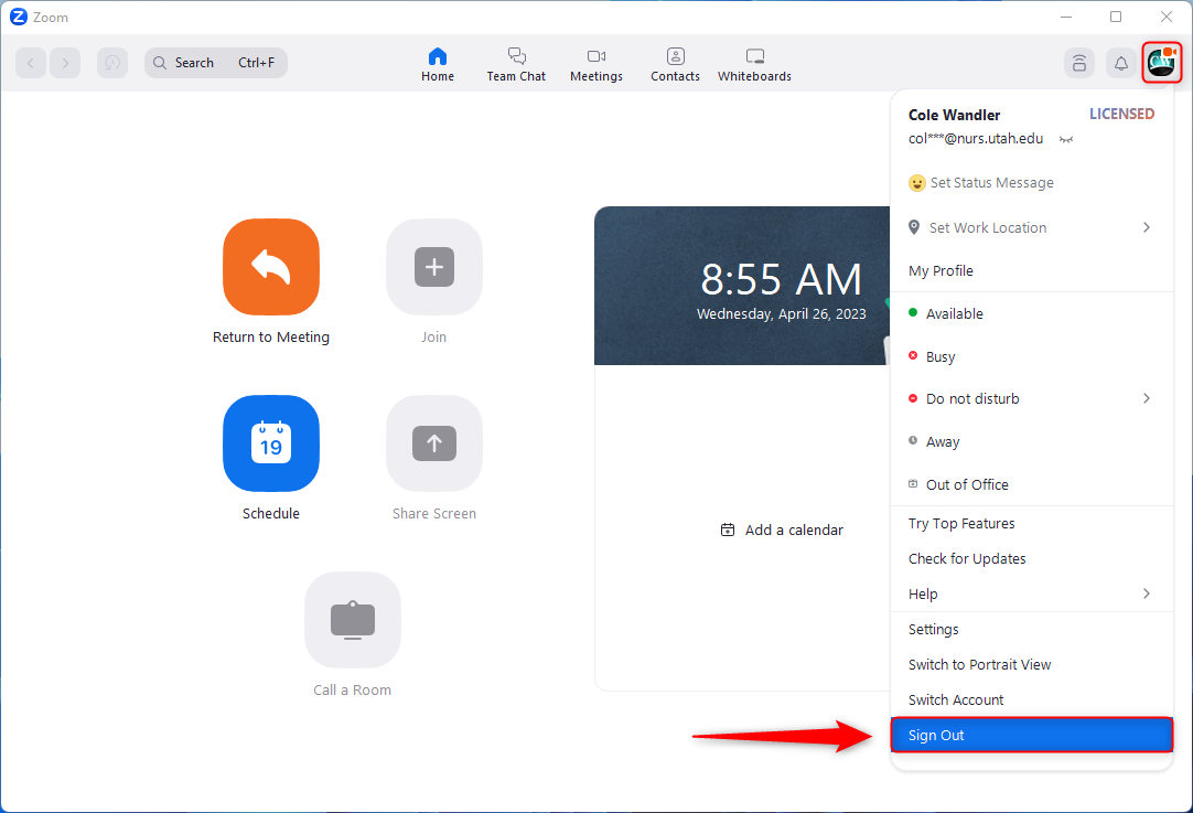 - When you open the app, first ask yourself, “Am I currently logged into my Utah Health Zoom account on the Zoom App?”. If the answer is “No” or “I’m not sure”, then log out of your current Zoom account by clicking on the picture in the right corner of the app and then choose the Sign Out option.