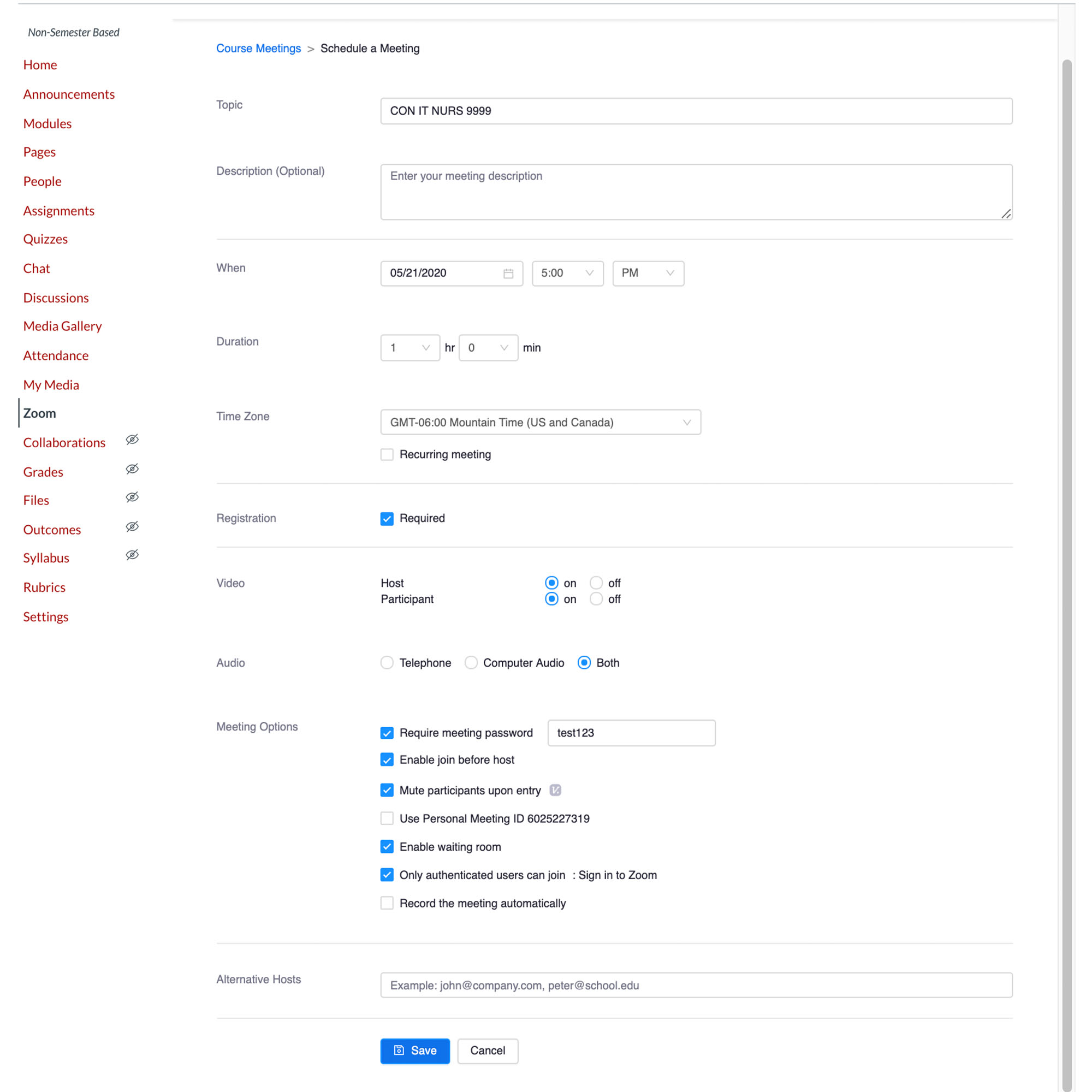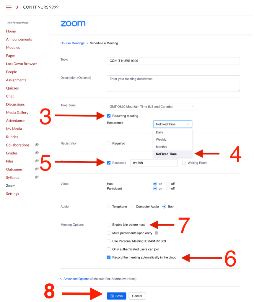 - Audio – Choose Both so if some students are having issues connecting, they can connect by phone.